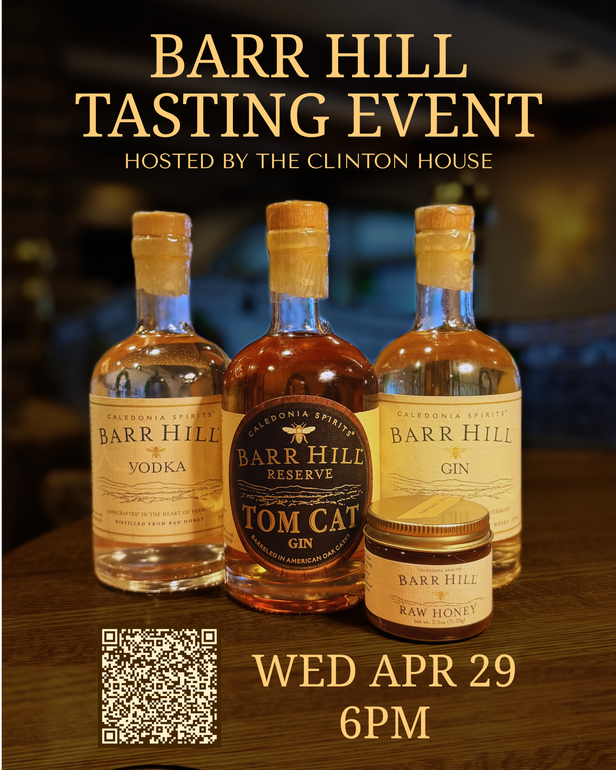 Join us at The Clinton House for an intimate and elevated tasting experience in collaboration with Barr Hill! This thoughtfully curated evening will feature a progression of handcrafted cocktails and pours, highlighting Barr Hill’s signature spirits, including their gin, Tom Cat gin, and vodka, each paired with chef-driven small bites designed to complement and enhance every sip.
